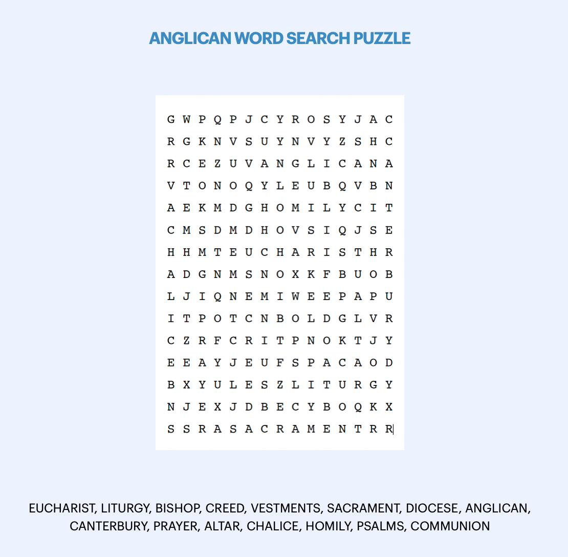 “Create a 15x15 word search puzzle with Anglican-themed words such as Eucharist, Liturgy, Bishop, Creed, Vestments, Sacrament, and Diocese. Include a word bank at the bottom.”