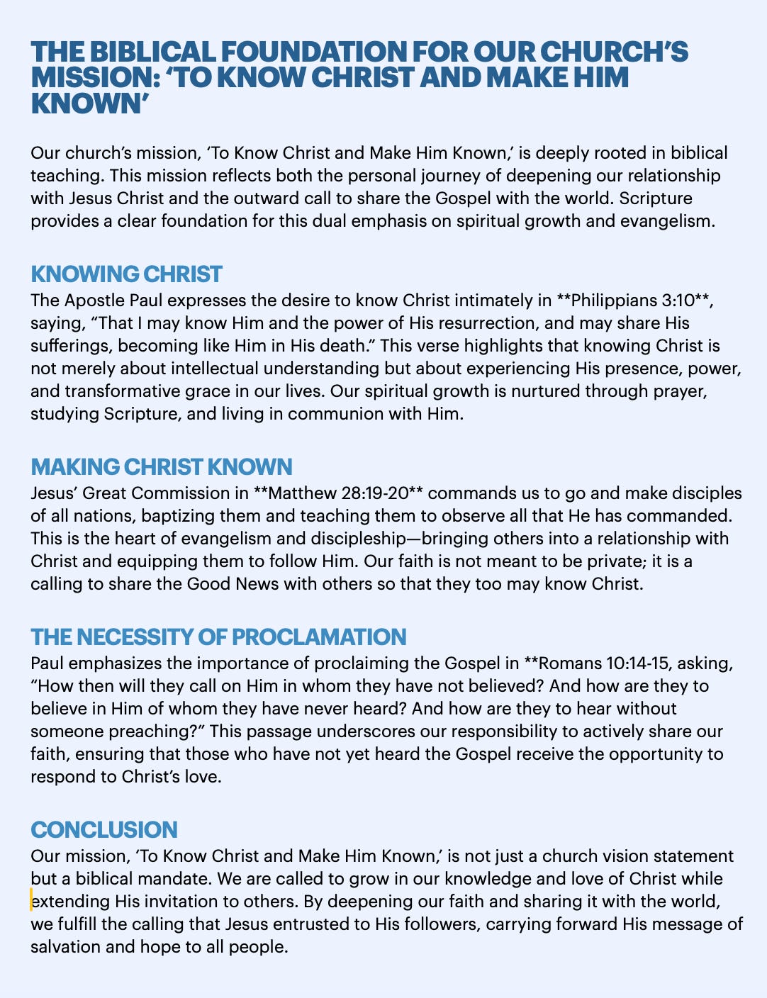 “Write a one-page summary explaining the biblical foundation for our church’s mission: ‘To know Christ and make Him known.’ Include key scriptures such as Matthew 28:19-20, Philippians 3:10, and Romans 10:14-15.”
