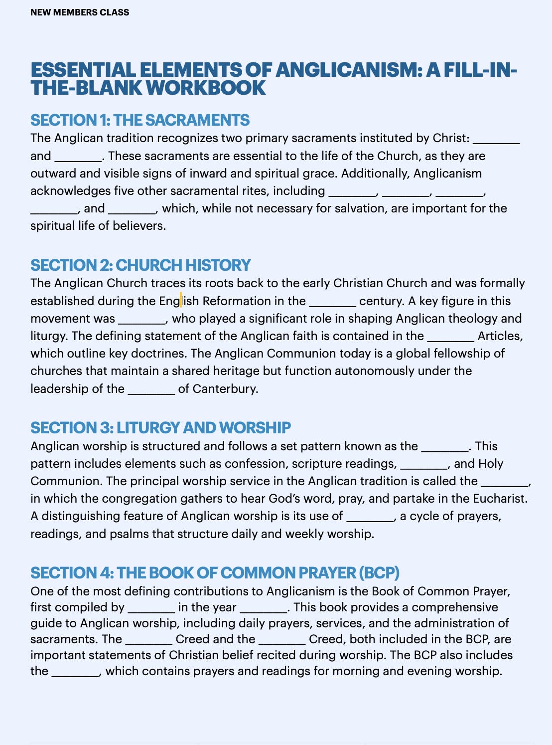 “Generate a structured fill-in-the-blank workbook on the essential elements of Anglicanism, including sections on sacraments, church history, liturgy, and the Book of Common Prayer. Each section should have a short explanation and key terms left blank for students to fill in.”