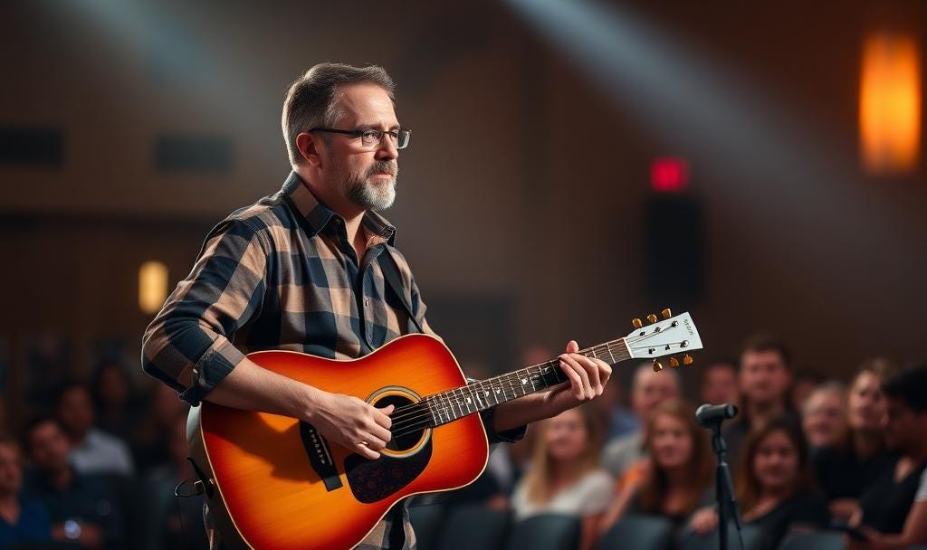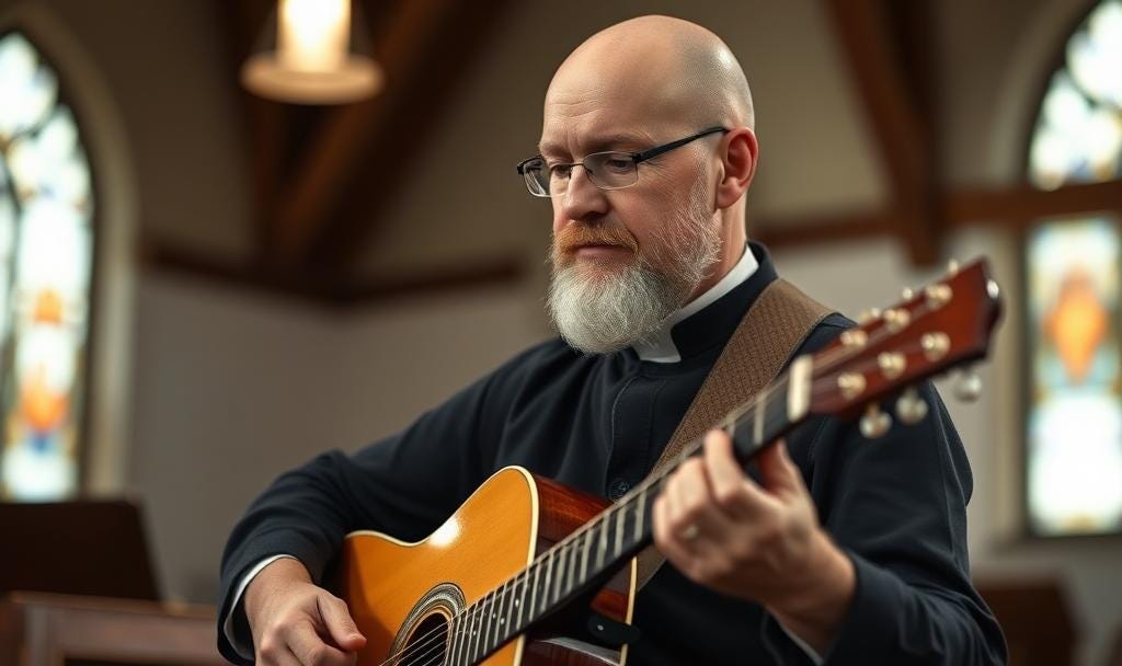 And here is what happens if I ask for a bald pastor without a beard playing the guitar.
